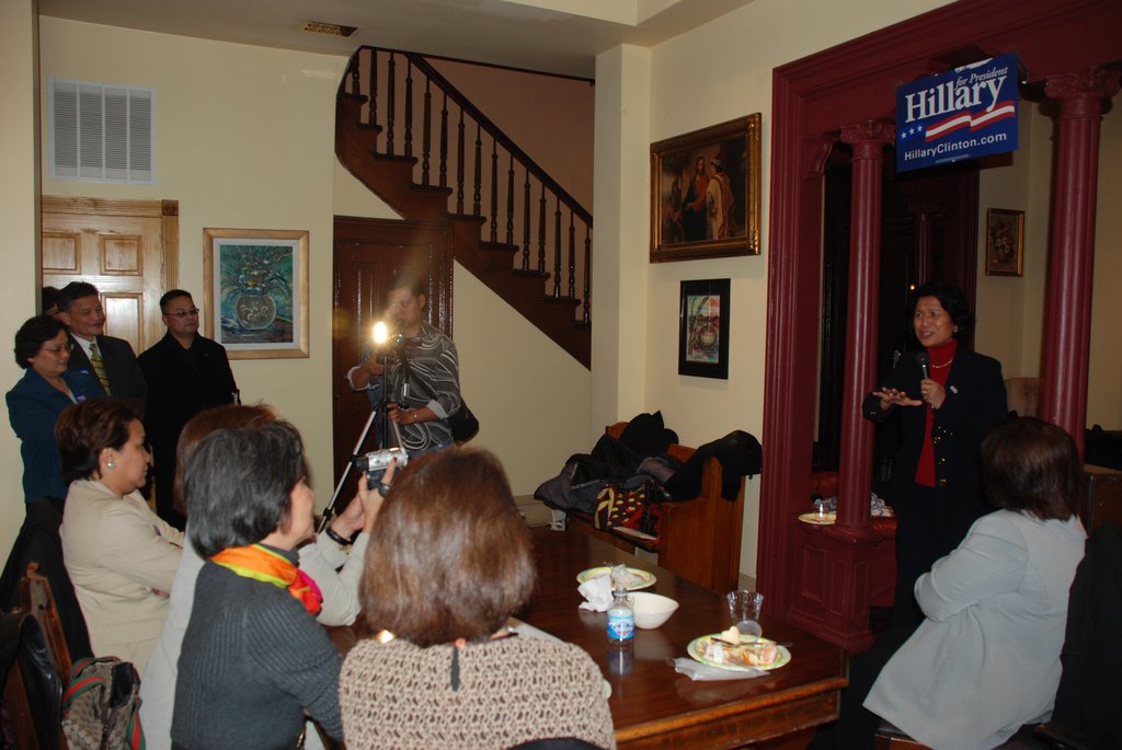 Organized and hosted by Hillary-convert and community leader, Marlon Pecson, the pre-dominantly female crowd responded to Lewis message with enthusiasm, cheering her on as she delivered her pep talk. Later, Jelly Carandang, a Filipino American commissioner in the Village of Skokie, signed up volunteers to help in the Iowa Caucus on January 3.