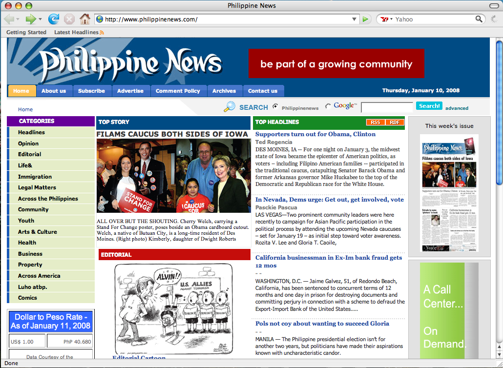 Clinton’s third place finish was particularly disappointing to her better-organized Filipino-American supporters here. Several gatherings had been organized by the community for the former first lady, a long-time supporter of the Filipino veterans issue. In one of their recent meetings, Los Angeles Mayor Antonio Villaraigosa, an early endorser of Clinton, showed up. LA has a significant Filipino population.
