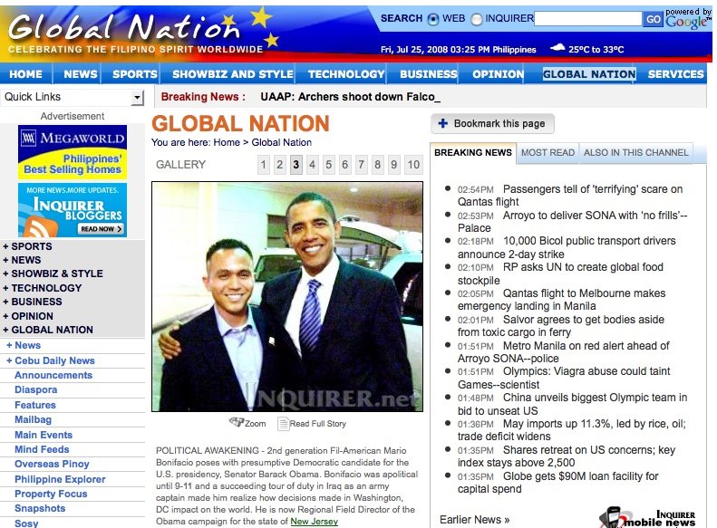 Bonifacio is the Regional Field Director of the Obama campaign for the state of New Jersey. He is one of the very few Filipino-Americans with an inside look at the campaign from its early stage. Recently, the campaign also recruited Charmaine Manansala as director of the Asian American Pacific Islanders voter outreach program.