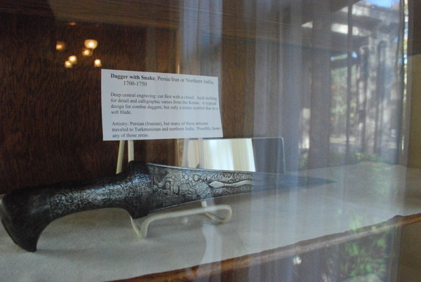 The exhibit features a collection of 50 swords and daggers, including a circa 1500 B.C. bronze sword from Luristan, Iran, to sickle-shaped swords from Africa, and daggers from Austria.