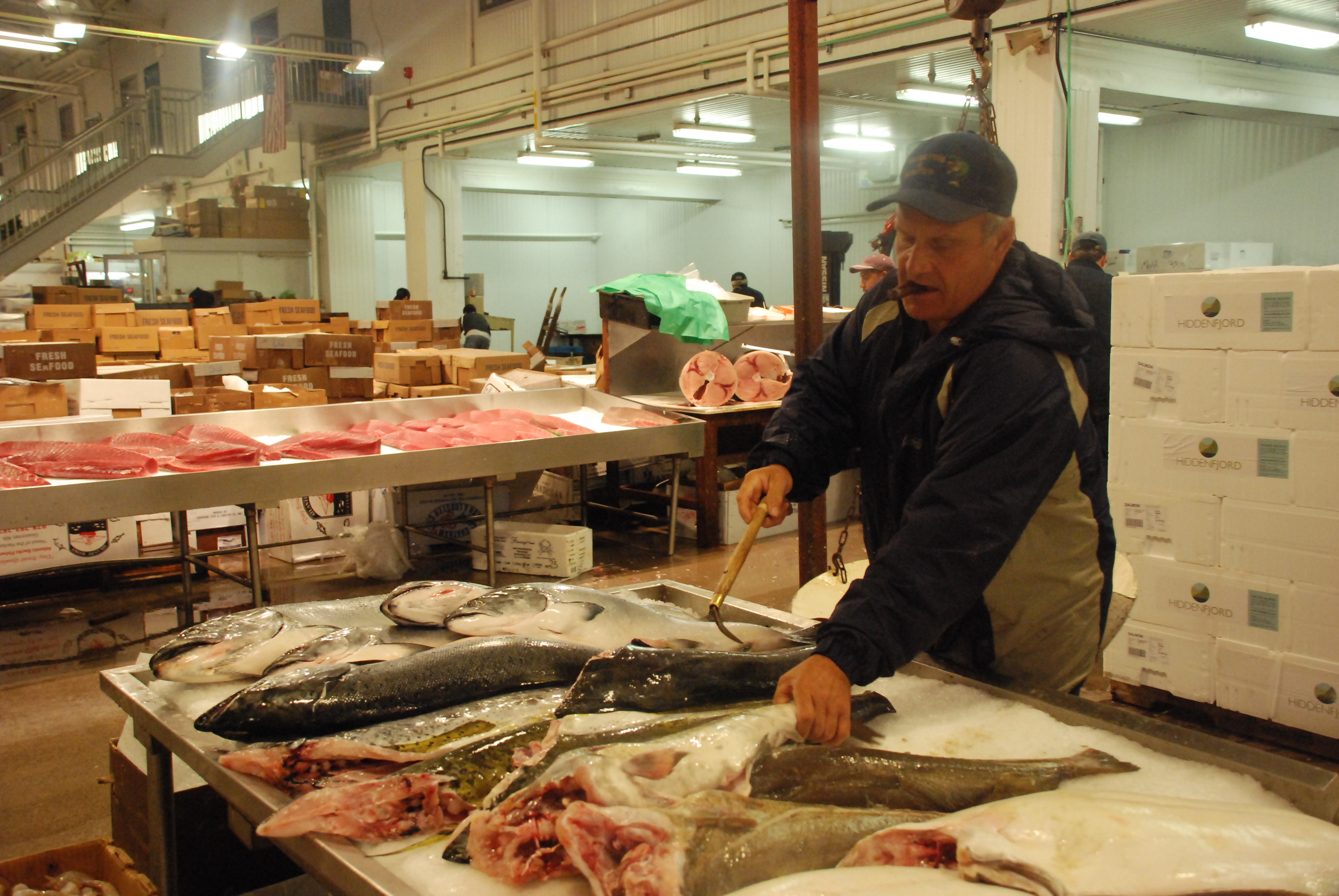 NEW YORK — It’s been almost six years since the New Fulton Fish Market moved to The Bronx on Nov. 14, 2005 after 180 years of smelling up lower Manhattan. The $86-million, half-mile long facility houses more than 30 wholesale distributors, bringing over a billion dollars in annual revenue. Critics contend it lacks the character of the old market by the Brooklyn Bridge, and its remote location contributes to a recent slump in sales. Others say the city-owned Hunts Point warehouse has modern amenities that keep the produce fresh and in high demand. Most recently, one operator declared bankruptcy leaving the warehouse 15 percent empty. But on a midnight visit not too long ago, the market still pulsates with energy. And with the thick smell of the sea wafting over the vending spots, there’s no mistaking this is the world’s second largest fish market.
