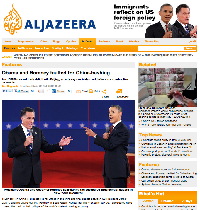 Obama and Romney faulted for China-bashing 10/22/2012 by Ted Regencia, posted in Business, Foreign Affairs, Politics By Ted Regencia For Al Jazeera English To read the full story, please visit the Al Jazeera website Share this: Share on Facebook (Opens in new window) Facebook Share on X (Opens in new window) X Email a link to a friend (Opens in new window) Email Like Loading...