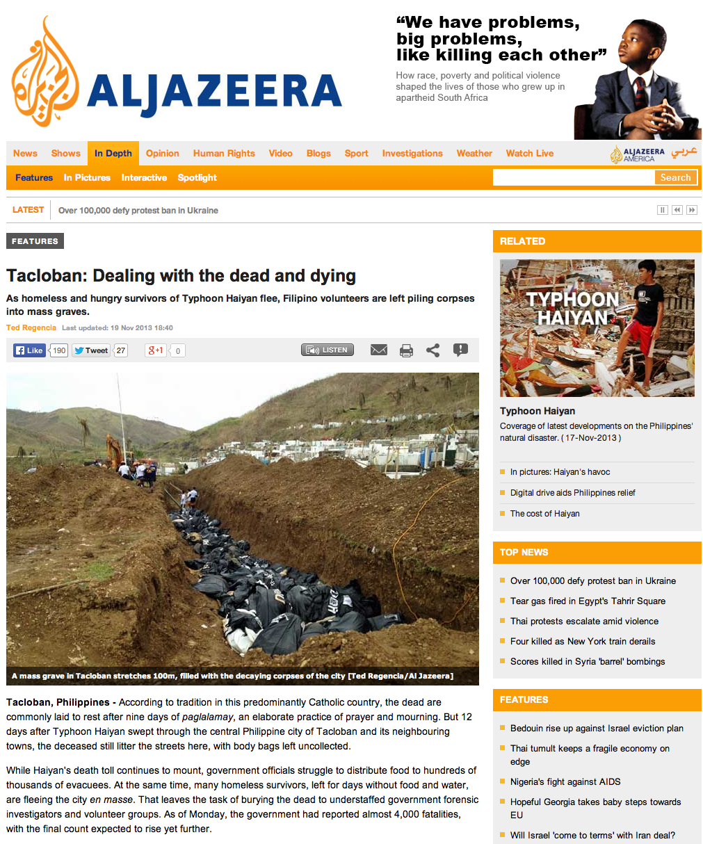 Tacloban: Dealing with the dead and dying 12/01/2013 by Ted Regencia, posted in Asia, Community, Environment, Philippines To read the full story, please visit the Al Jazeera website Share this: Share on Facebook (Opens in new window) Facebook Share on X (Opens in new window) X Email a link to a friend (Opens in new window) Email Like Loading...