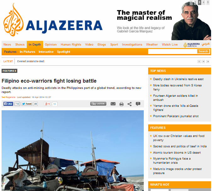 Filipino eco-warriors fight losing battle 04/20/2014 by Ted Regencia, posted in Uncategorized To read full story, please visit Al Jazeera website Share this: Share on Facebook (Opens in new window) Facebook Share on X (Opens in new window) X Email a link to a friend (Opens in new window) Email Like Loading...