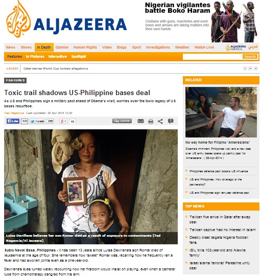 Toxic trail shadows US-Philippine bases deal 06/01/2014 by Ted Regencia, posted in Uncategorized To read the full story, please visit the Al Jazeera website Share this: Share on Facebook (Opens in new window) Facebook Share on X (Opens in new window) X Email a link to a friend (Opens in new window) Email Like Loading...
