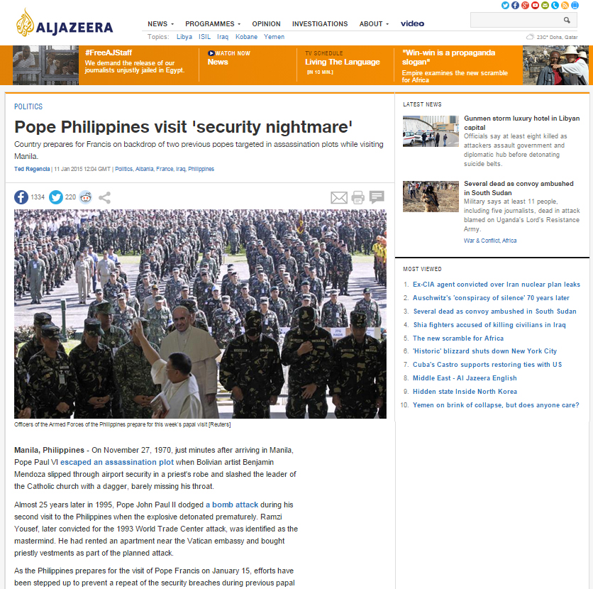 Pope’s Philippine visit a ‘security nightmare’ 01/27/2015 by Ted Regencia, posted in Uncategorized To read the full story, please visit the Al Jazeera website Share this: Share on Facebook (Opens in new window) Facebook Share on X (Opens in new window) X Email a link to a friend (Opens in new window) Email Like Loading...