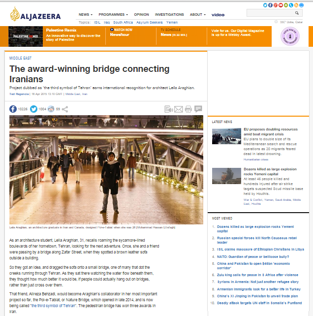 Bridging Iran’s future: Tehran project earns praise for 31-year old female architect 04/20/2015 by Ted Regencia, posted in Uncategorized To read the full story, please visit the Al Jazeera English website Share this: Share on Facebook (Opens in new window) Facebook Share on X (Opens in new window) X Email a link to a friend (Opens in new window) Email Like Loading...