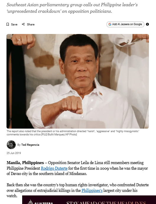 Duterte attempting to ‘silence political opponents’: Report 04/06/2026 by Ted Regencia, posted in Uncategorized To read the full story, please visit the Al Jazeera English website Share this: Share on Facebook (Opens in new window) Facebook Share on X (Opens in new window) X Email a link to a friend (Opens in new window) Email Like Loading...