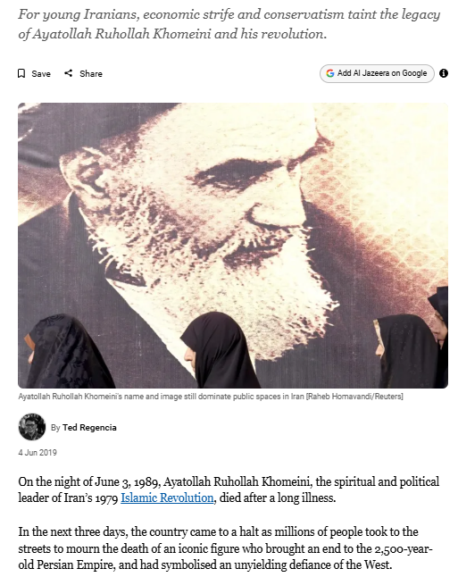 Iran: Supreme leader’s legacy debated 30 years after his death 04/06/2026 by Ted Regencia, posted in Uncategorized To read the full story, please visit the Al Jazeera English website Share this: Share on Facebook (Opens in new window) Facebook Share on X (Opens in new window) X Email a link to a friend (Opens in new window) Email Like Loading...