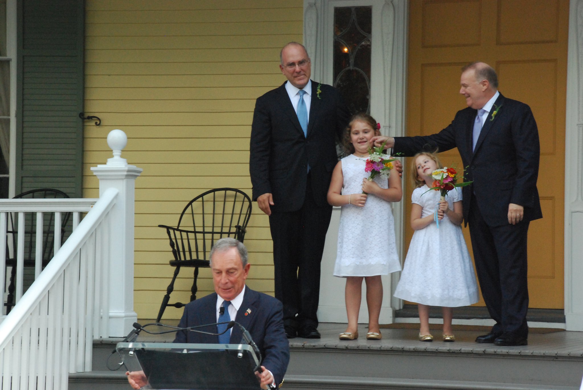 New York Mayor Michael Bloomberg presides over the gay marriage ceremony of his top aides Jonathan Mintz (left) and John Feinblatt (right), on Sunday, July 24, 2011 the first day that same-sex unions were allowed in the state. While the state law is not recognized by the federal government, Bloomberg said it marks another historic step for civil rights in the U.S. Also in photo, Mintz and Feinblatt’s daughters Maeve, 8, and Georgia, 6. (TED REGENCIA/To read the full story, please click here.)