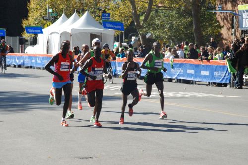 Race leaders of the 2011 New York marathon’s men’s division, including eventual winner and marathon record-holder Geoffrey Mutai (right) breeze through the Bronx shortly after passing the 20-mile marker, Sunday, Nov. 6, 2011. An estimated 47,000 runners from 107 countries took part in the competition. (TED REGENCIA)