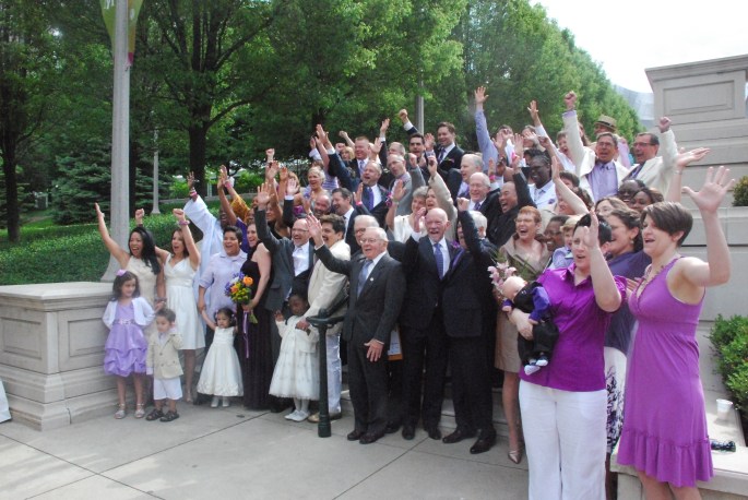 Thirty five same-sex couples and their families let a loud cheer shortly before a mass civil union ceremony at the Millenium Park in Chicago, Thursday, June 2, 2011. Illinois Governor Pat Quinn, who signed the legislation legalizing gay civil union, joined Chicago Mayor Rahm Emanuel at the event. (TED REGENCIA/To read the full story, please click here.)