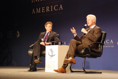 Former President Bill Clinton and U.S. Treasury Secretary Timothy Geithner talk about the state of the American economy during the second day of a jobs summit in Chicago, Thursday, June 30, 2011. Aside from the debt ceiling impasse, Clinton also grilled Geithner about the his reported departure from the Treasury Department, which the latter denied. (TED REGENCIA/To read the full story, please click here.)