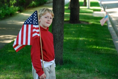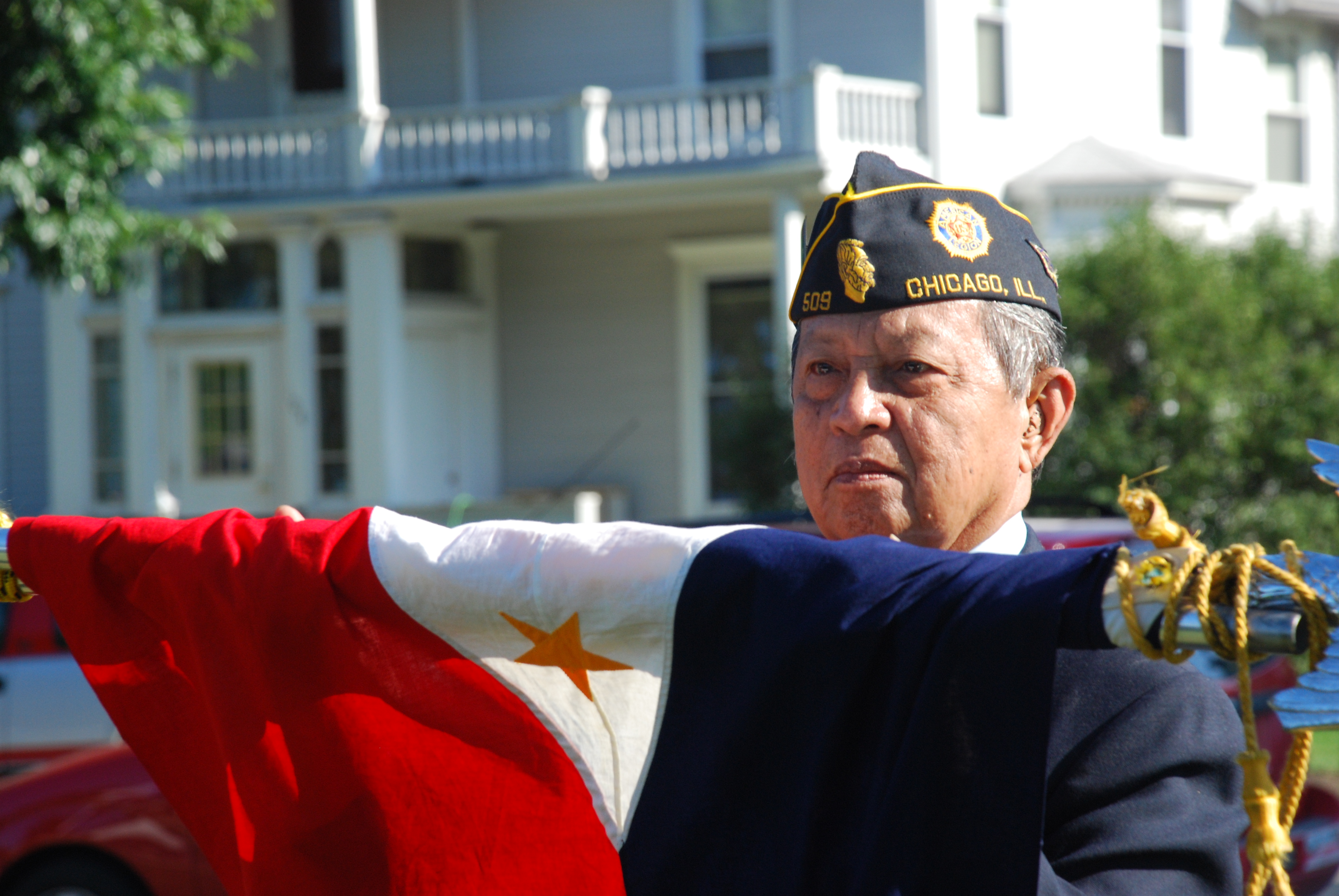 A Filipino American veteran of World War II carries the Philippine flag at the conclusion of the commemoration of the Bataan Death March in Maywood, Illinois, Sept. 9, 2007. The 60-mile march in 1942, which followed the Japanese invasion, claimed the lives of five to 10 thousand Filipinos and over 600 Americans. (TED REGENCIA)