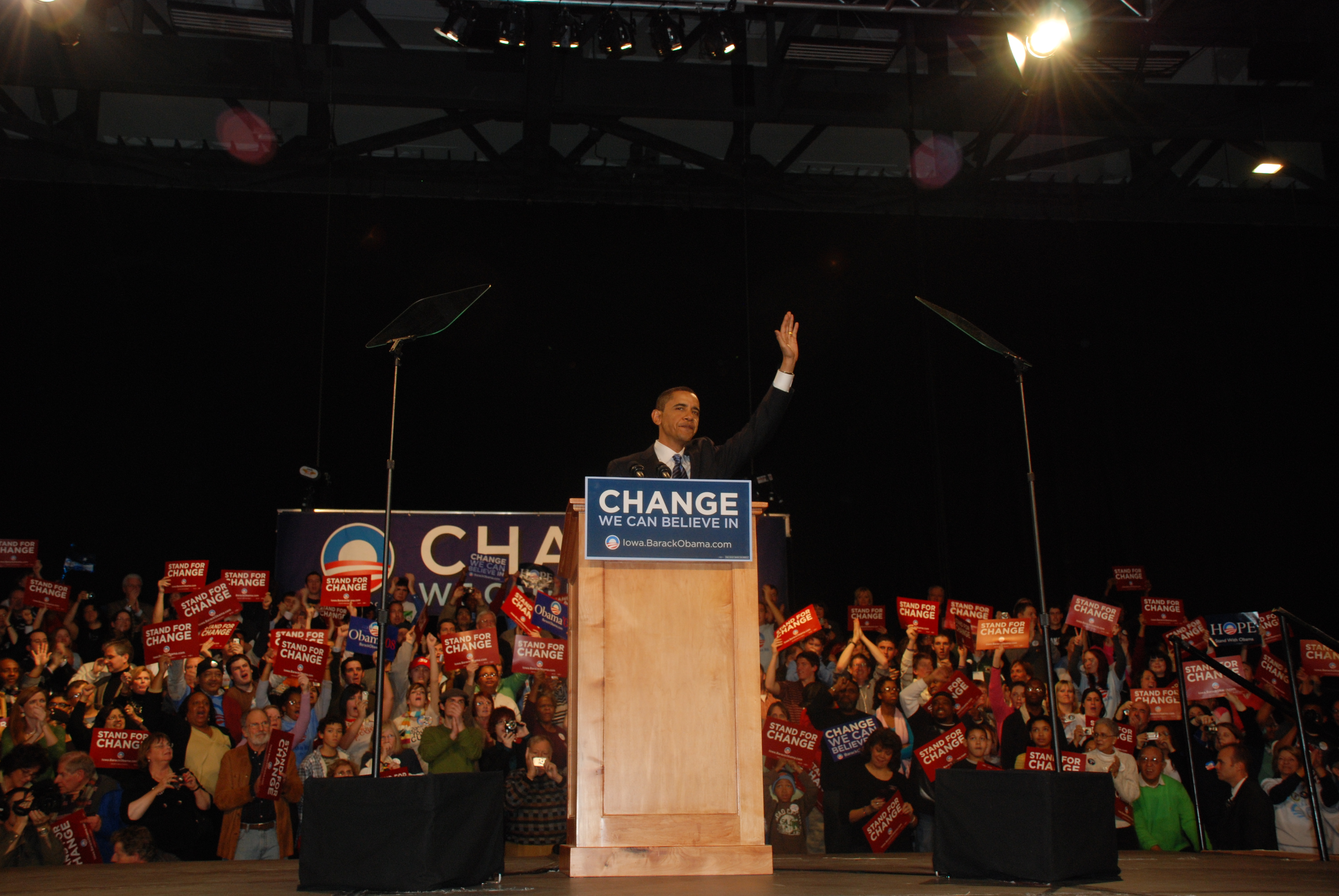 On the road to his presidential nomination, U.S. Senator from Illinois Barack Obama celebrates a crucial victory in Iowa on Tuesday, January 4, 2008. Obama won 38 percent of the Democratic vote defeating frontrunner Sen. Hillary Clinton from New York and former Democratic nominee for vice president John Edwards. (TED REGENCIA/To read the full story, please click here.)