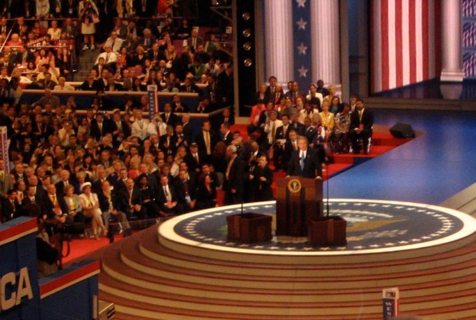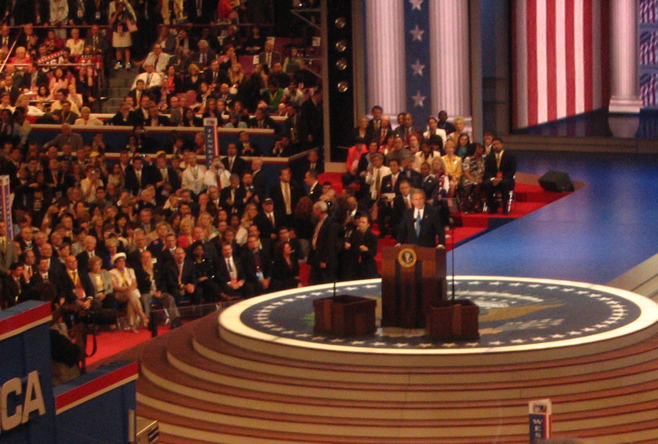 President George W. Bush accepts his nomination for re-election, Sept. 2, 2004, at the Republican National Convention in New York. Bush and his vice president Richard Cheney faced Senators John Kerry and John Edwards, as the Democratic nominees for president and vice president during the general election, Nov. 2, 2004. (TED REGENCIA)